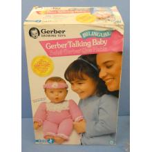 GERBER ~ Bilingual Gerber Talking Baby Toy Biz Bilingual Gerber Talking Baby Doll never played with (box shows wear/damage from storage) (requires 4 AA batteries to work) Status: AvailableYear: 1995Price: $60.00
