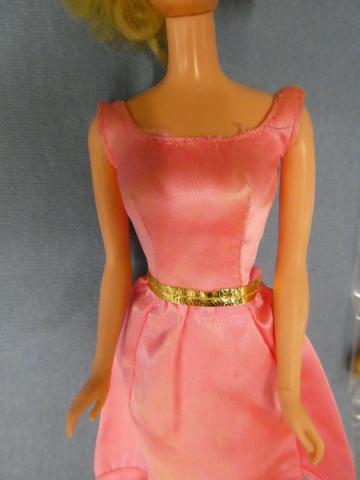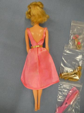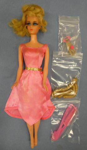 VB217 1970 Barbie with Growin' Pretty Hair Barbie with Growin' Pretty Hair Pretty face, good lashes ~Dress (vibrant, but played with) ~knees click (hips frozen) ~includes all accessories shown Price: $175.00Status: Available Additional Images