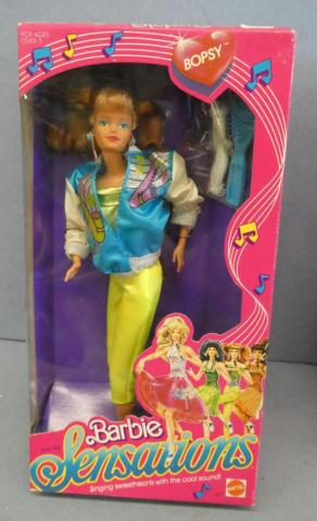 1987 Barbie and the Sensations ~ Bopsy (#1) Barbie and the Sensations Bopsy 4967 ~faint spotting to legs (very common for these dolls) Year: 1987Price: $35.00Condition: Never Removed From BoxStatus: Available Additional Images