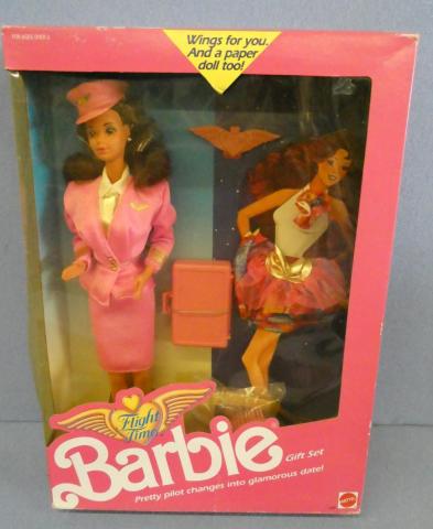 * 1989 Flight Time Barbie Gift Set Flight Time Barbie Gift Set (Hispanic version) 2066 (window yellowed) (crack in corner edge of window) Year: 1989Price: $95.00Condition: Never Removed From BoxStatus: Available Additional Images