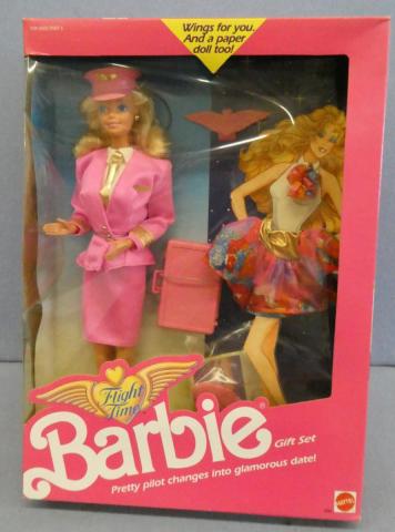 1989 Flight Time Barbie Gift Set (#1) Flight Time Barbie Gift Set Caucasian 9584 (window loose, left side of box warped) Year: 1989Price: $35.00Condition: Never Removed From BoxStatus: Sold Additional Images