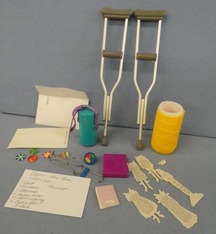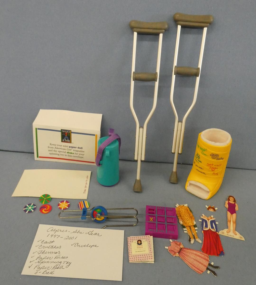 **AG302 American Girl of Today Apres-Ski Gear 1997-2001 Cast, crutches, thermos, paper discs, spinning toy, paper doll, 8-ball and envelope Price: $40.00Status: Available Additional Images