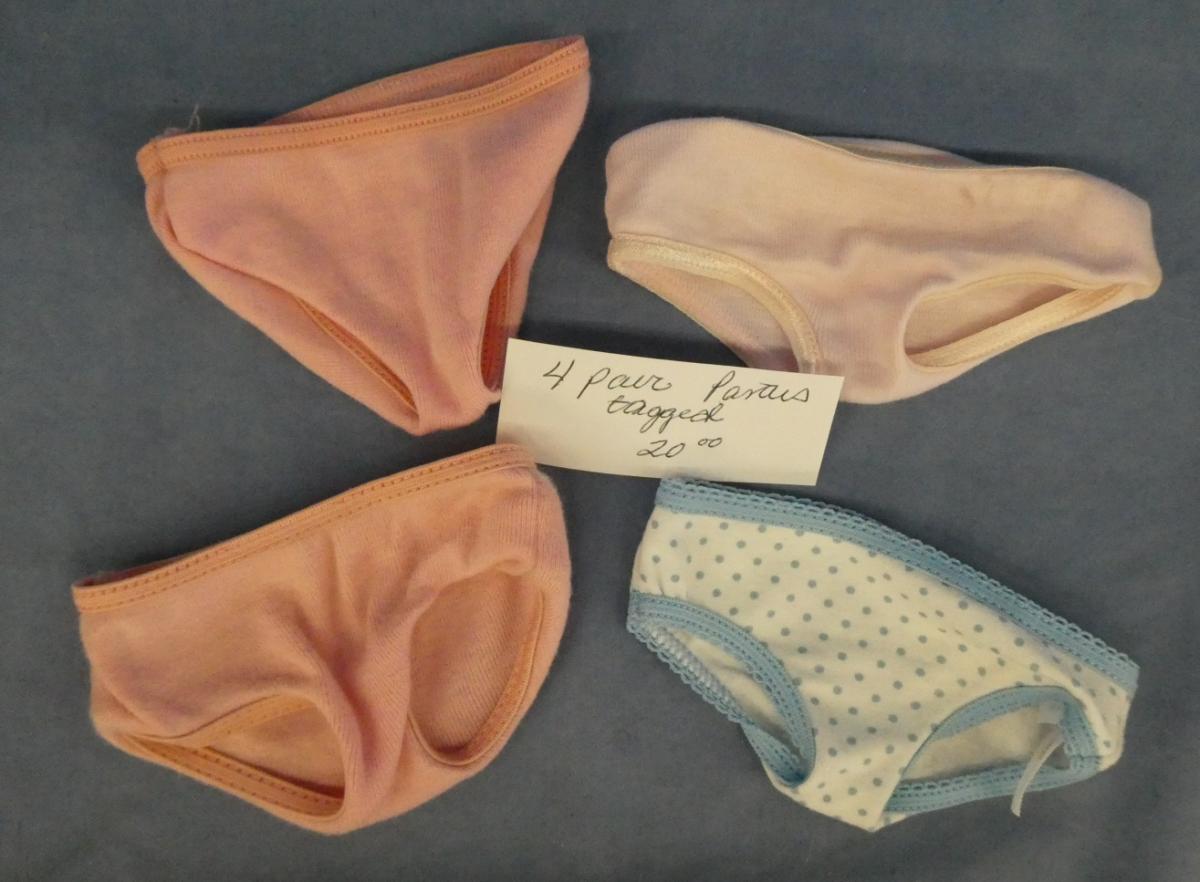 **AGA10 American Girl 4 Pair of Tagged Panties Blue Pink Pale Pink 2 Brighter Pink Price: $20.00Status: Available Additional Images