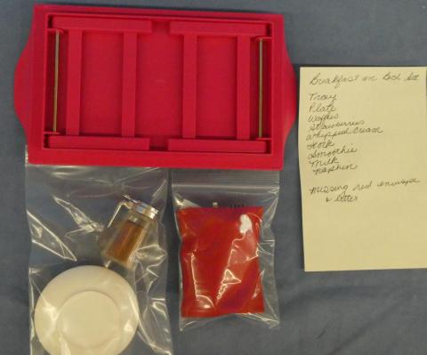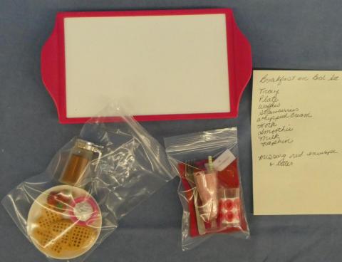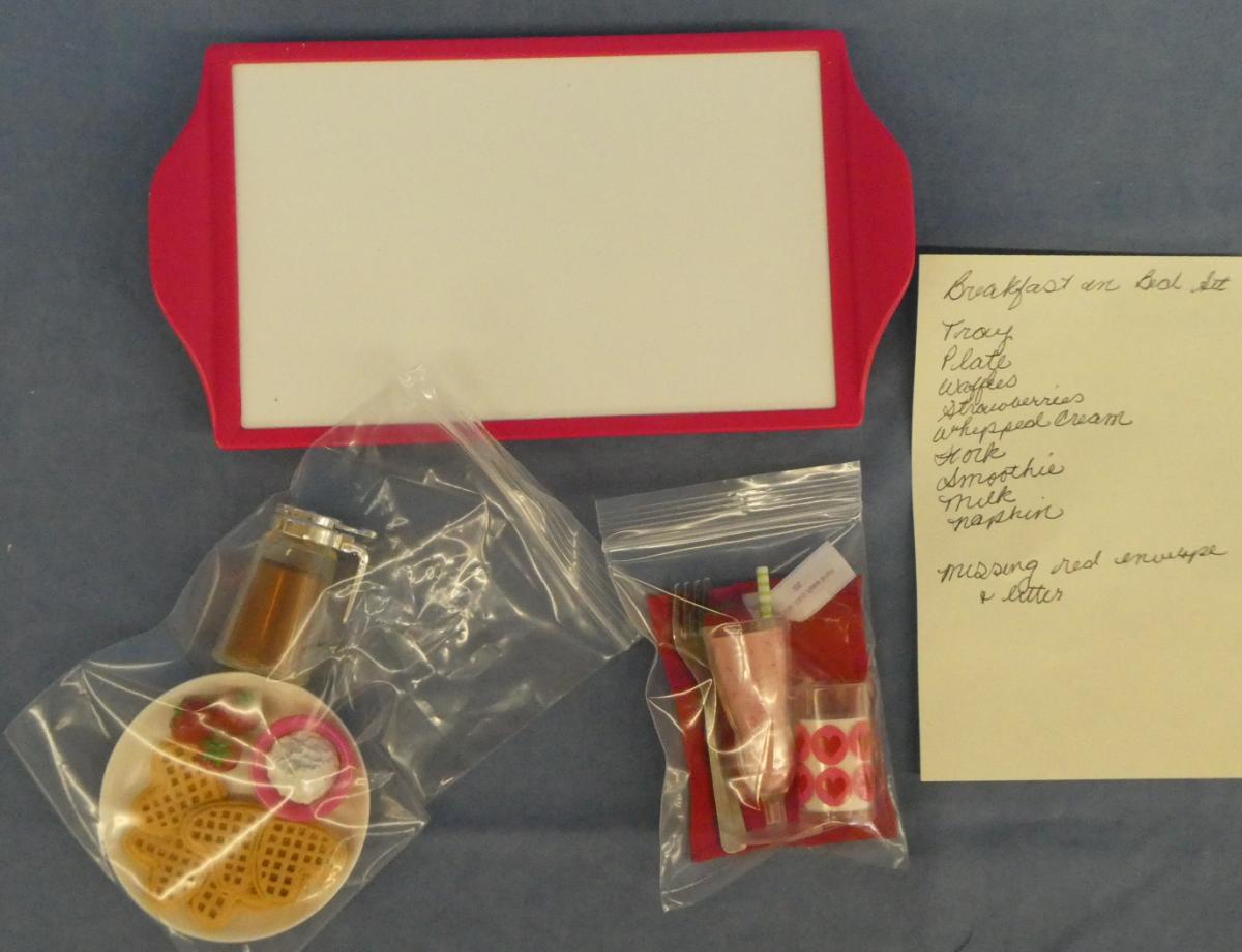 **AGF209 American Girl Breakfast in Bed Tray, plate, waffles, strawberries, whipped cream, fork, smoothie milk, 1 napkin Price: $30.00Status: Available Additional Images