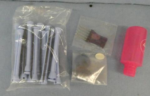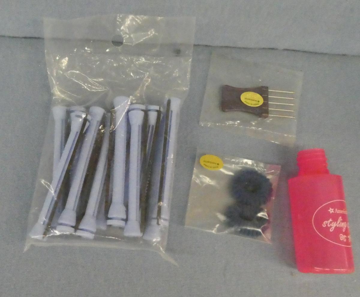 **AGH33 American Girl Hair Supplies Never Removed From Package Items Hair Pick, 2 Scrunchies and 12 Purple Hair Rods Not in Package 1 Styling Spray Bottle (mssing lid) and Salon Drape Price: $10.00Status: Available Additional Images