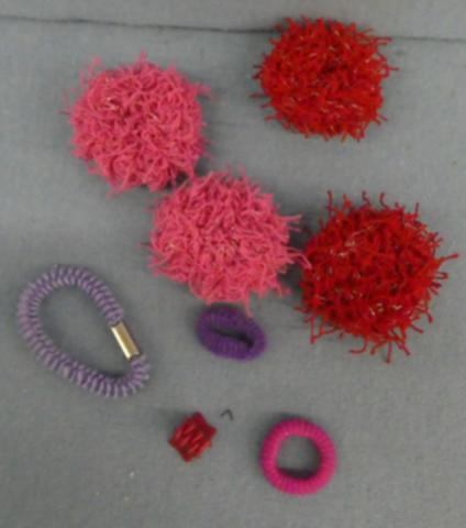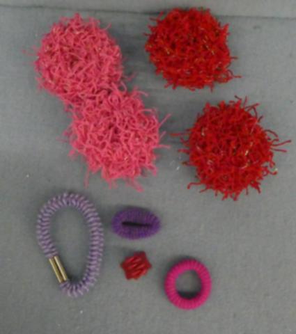 **AGH40 American Girl Hair Accessories 2 red scrunchies, 2 pink, 1 small purple, 1 small pink 1 medium light purple hair holders Price: $5.00Status: Available Additional Images