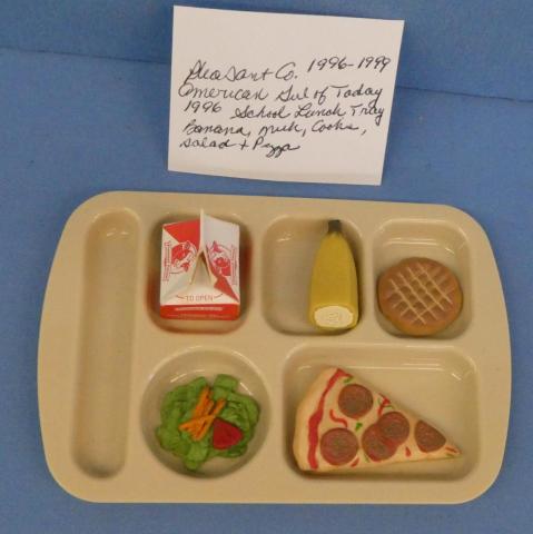 ++AGT125 American Girl of Today School Lunch Tray Pleasant Company 1996-1999 Banana, milk, cookie, salad and pizza Not complete Price: $15.00Status: Available