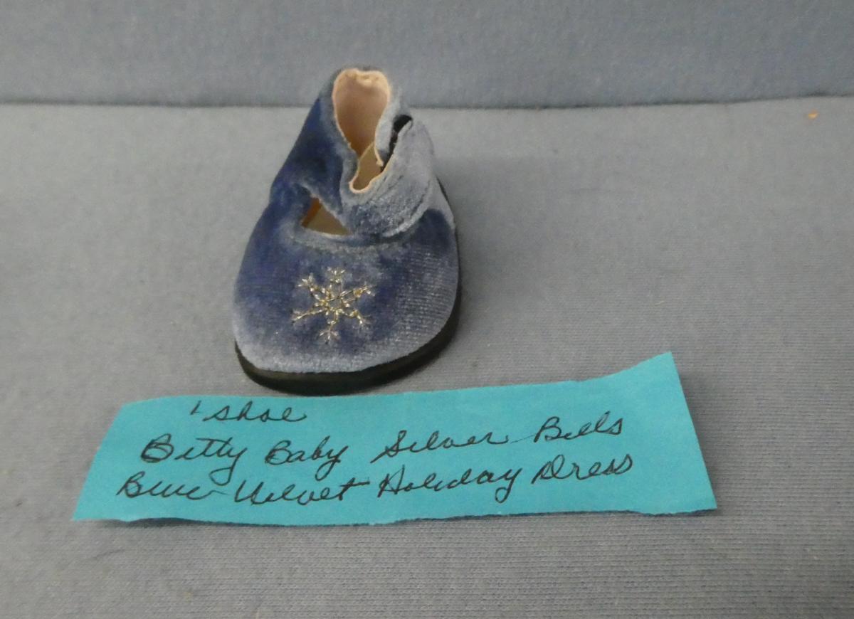 **BBS44 Bitty Baby Left Shoe to Silver Bells Blue Velvet Holiday Dress Price: $2.00Status: Available Additional Images