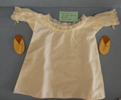 **FM08 American Girl Felicity's Nightgown and Mules 2 small spots on back Price: $25.00Status: Available Additional Images