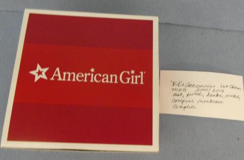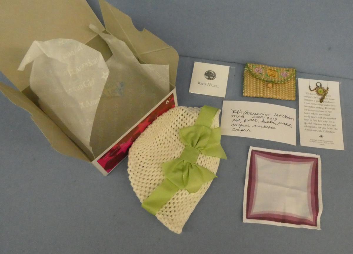 **KK26 American Girl Kit's 1st Edition Accessories American Girl Tag Hat, purse, hankie, nickel and Compass necklace Complete Price: $60.00Condition: Mint in BoxStatus: Available Additional Images
