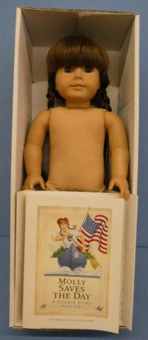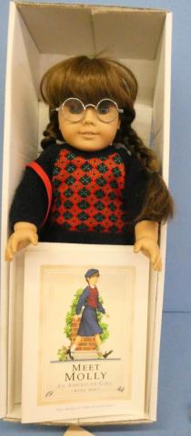 ++MM203 American Girl Molly in Box MDP Skirt,, dickie, sweater, shoes, socks, panties 2 Books and 1 Pair Glasses Box is not in mint condition Price: $160.00Status: Available Additional Images