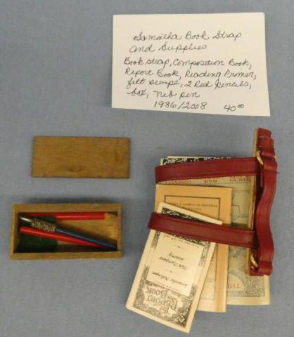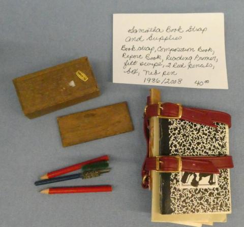 **SP15 American Girl Samantha's Book Strap and Supplies 1986 (Pleasant Company sticker present) Book Strap, Composition Book, Report Book, Reading Primer, Green Felt Wipe, 2 Red Pencils, Wood Box and Nib Pen Price: $40.00Status: On Hold Additional Images