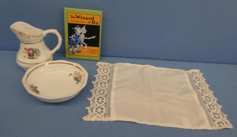 ++SP178 American Girl Samantha's Nighttime Necessities Pleasant Company \1986-2008 Bowl, pitcher, Wizard of Oz book, towel Complete Price: $50.00Status: Available Additional Images