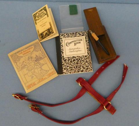 ++SP180 American Girl Samantha's Book Strap and Supplies 1986-2008 Baldwin Primer, Book Strap, Pencil Box with Neb Pen, Report Book, Composition Book, Eraser Price: $50.00Status: Available Additional Images
