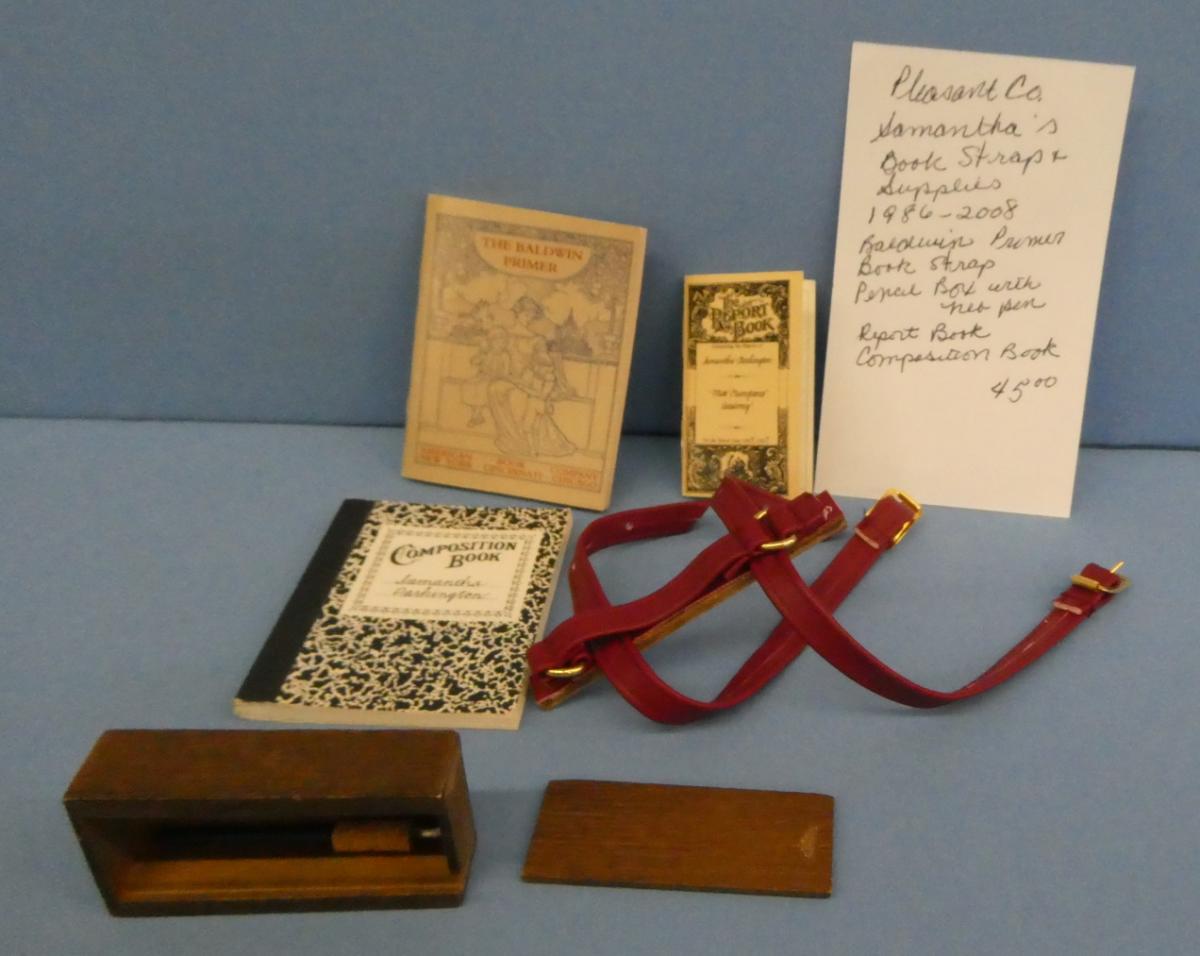 ++SP180 American Girl Samantha's Book Strap and Supplies 1986-2008 Baldwin Primer, Book Strap, Pencil Box, wiper, and Nib Pen Price: $50.00Status: Available Additional Images
