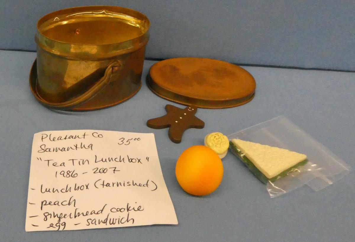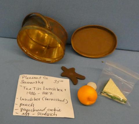 ++SP57 American Girl Samantha's Tea Tin Lunch Box Pleasant Company 1986-2007 Tin, Peach, Gingerbread Cookie, Egg and Sandwich Lunch box is tarnished Price: $35.00Status: Available Additional Images