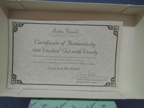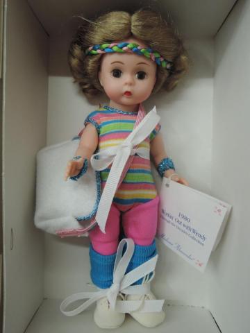 Madame Alexander 1980 Workin' Out with Wendy #17810 8" 1980 Workin' Out Wendy Limited Edition 865 of 3000 Bent Knee Made in New York Year: 1999Price: $45.00Condition: Mint in BoxStatus: Available Additional Images