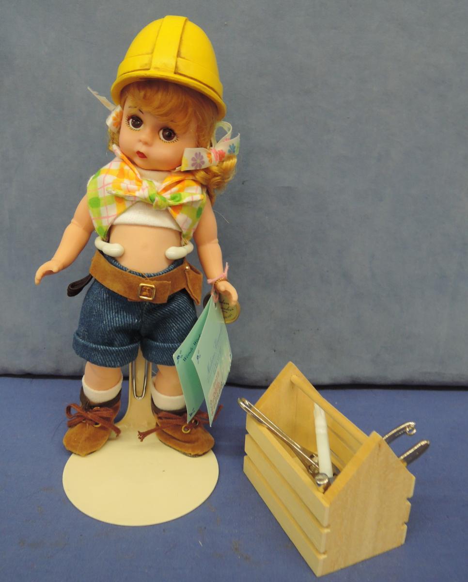 Madame Alexander Wendy Works Construction 8" Wendy Works Construction When I Grow Up with tool box #31420 Made in New York Price: $50.00Status: Available Additional Images