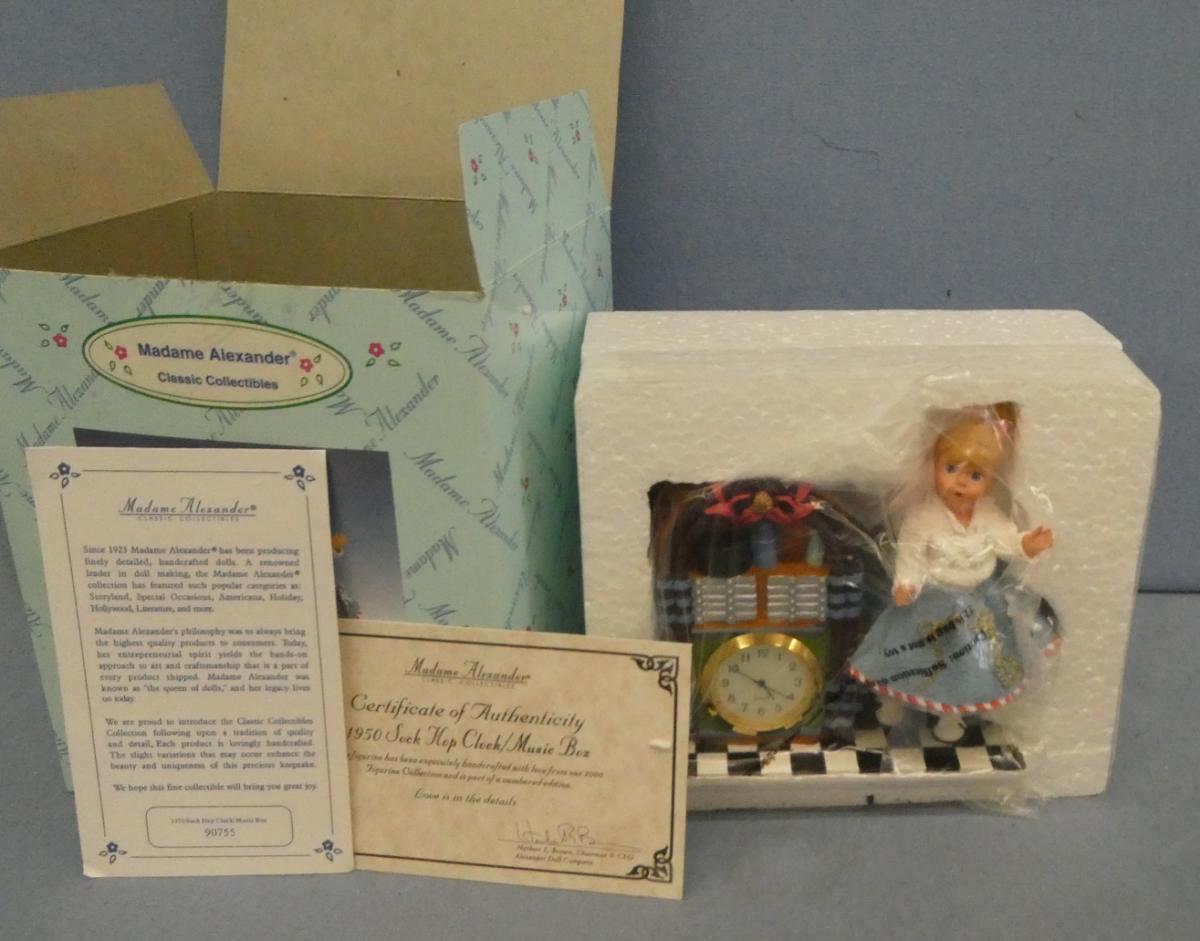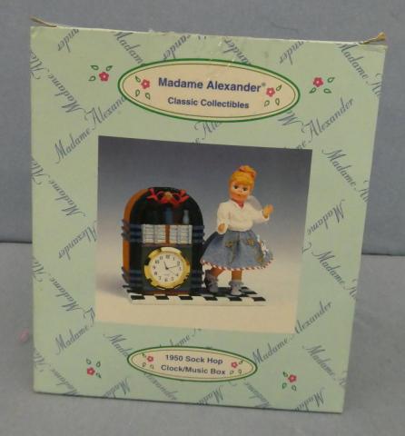 ++POC03 Madame Alexander 1950's Sock Hop Clock/Music Box Plays Rock Around the Clock Year: 2000Price: $10.00Condition: Mint in BoxStatus: Available Additional Images