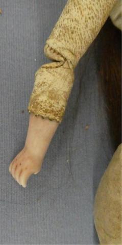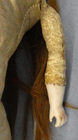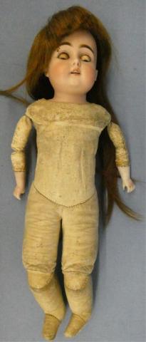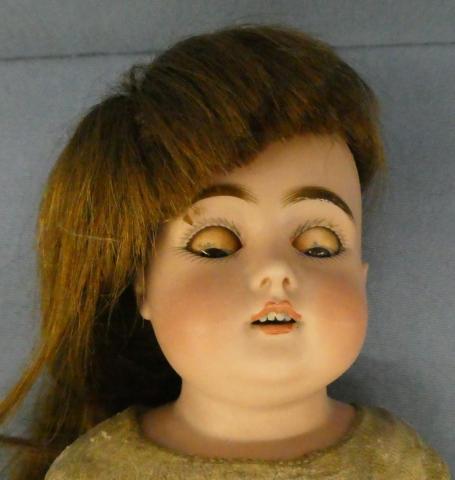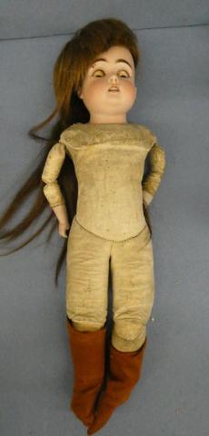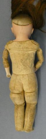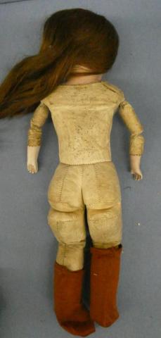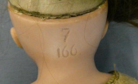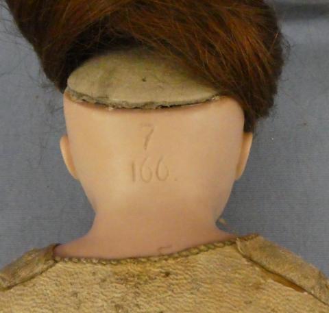 15 1/2" Marked 7 over 166 Shoulder Plate Leather body, brown sleep eyes, open mouth with 4 teeth, human hair wig Price: $50.00Status: Available Additional Images