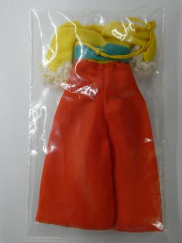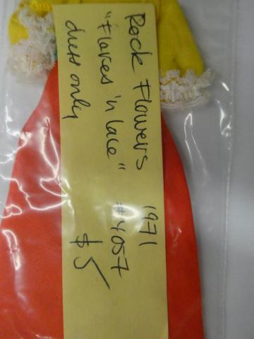 Mattel Rock Flowers ~ Flares 'n Lace outfit (D) Rock Flowers by Mattel Flares 'n Lace fashion # 4057 (jumpsuit only) Year: 1971Price: $5.00Condition: Lightly Played WithStatus: Available Additional Images