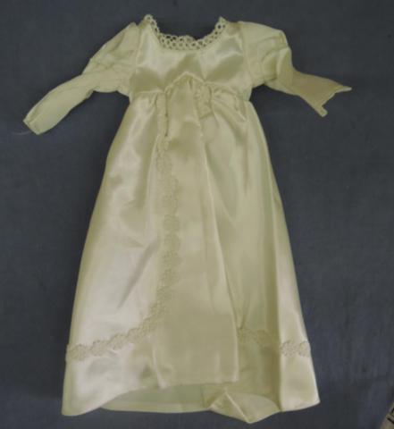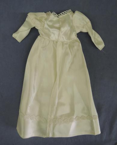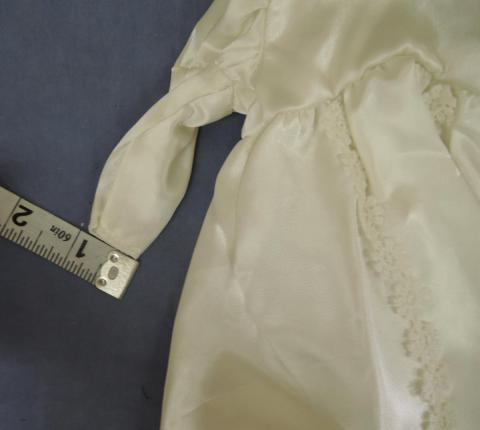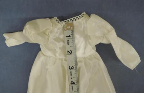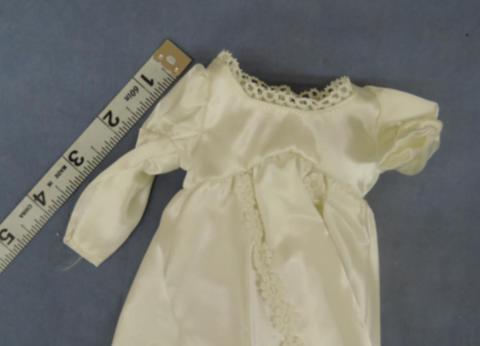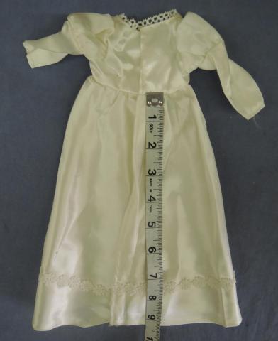DC1838 Wedding Gown About 11 1/2" Top of bodice to hem Wedding Gown for 10"-12" Note the small arms and hand opening Click on picture for measurements Price: $10.00Status: Available Additional Images