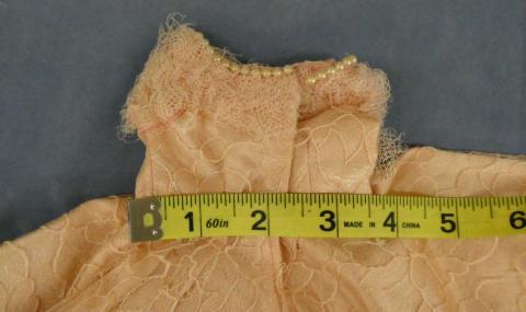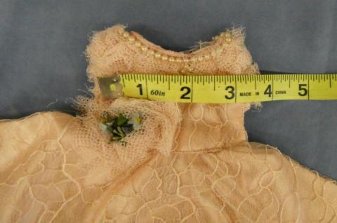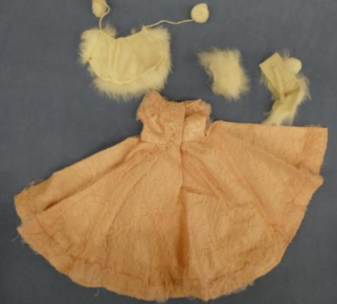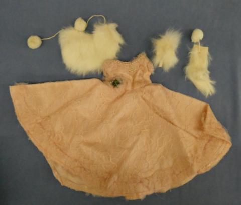 DC2026 Pink Gown Ensemble 10" Neck to hem Lacy pink gown (some pearls need sewn) Hat, cape and muff Price: $15.00Status: Available Additional Images