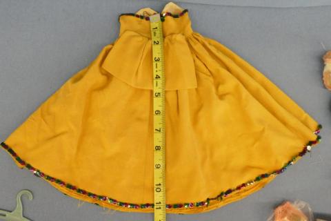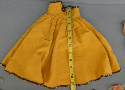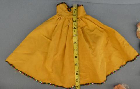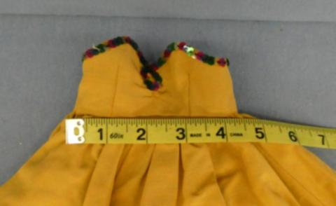 DC6031 Gold Strapless Gown Vintage 11" back of bodice to hem 12" Top of bodice to hem Hook and eye enclosure Metal snap for bow Price: $10.00Status: Available Additional Images