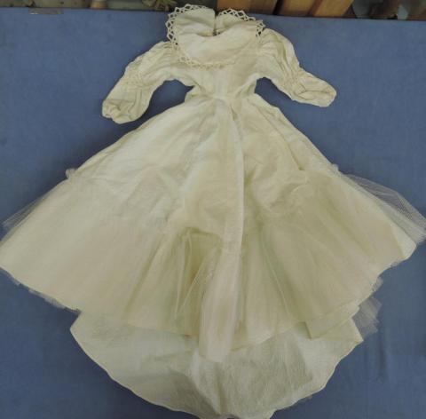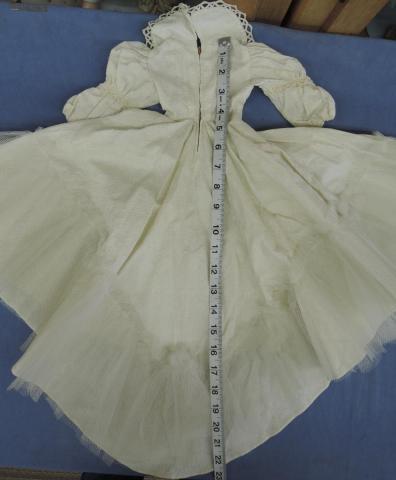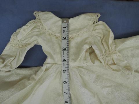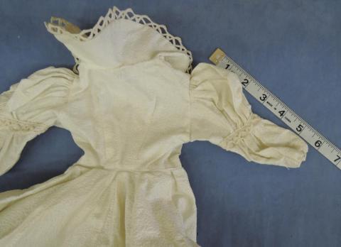 DC752 Brocade Gown About 23" Shoulder to hem (longest) White Brocade Gown with Zipper Closure Click on picture for measurements Price: $20.00Status: Available Additional Images