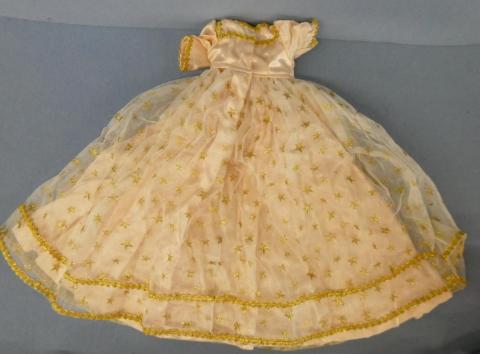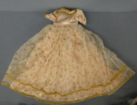 **DC8077 Pink Gown with Gold Star Overskirt 17" Shoulder to Hem Includes hooped petticoat Custom made by Betty Herr for 18" doll` Price: $30.00Status: Available Additional Images