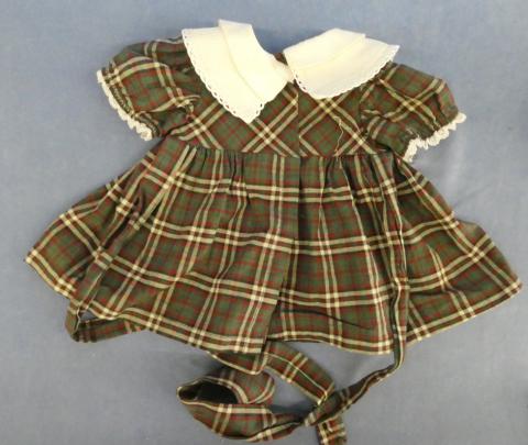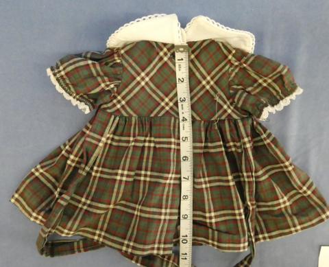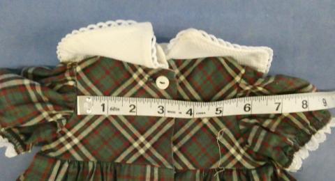 DC2088 Plaid Dress 11" Neck to hem Needs snap or hook/eye at waist Tie belt For about a 22" doll Click on picture for measurements Price: $10.00Status: Available Additional Images