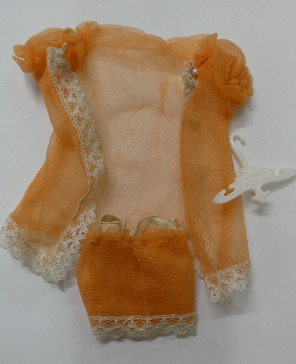 DW672 Midnight Lace TOPPER TOYS Dawn Midnight Lace # 725 (apricot variation) ~hanger, nightie and robe only ~very played with Price: $6.00Status: Available