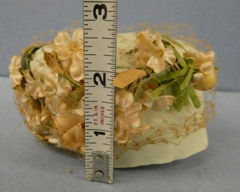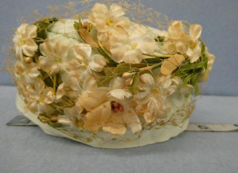 HAT47 4 1/2" Green Pillbox Hat with Flowers and Hairnetting Price: $20.00Status: Available Additional Images