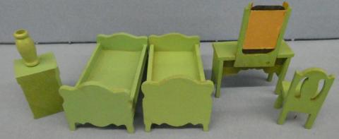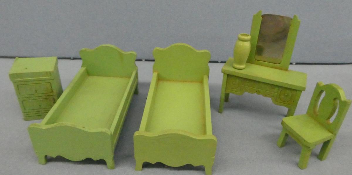 STR001 Strombecker Wood Furniture Green Twin Beds, Vanity and Chair, Vase and Night Stand 1930's Price: $35.00Status: Available Additional Images