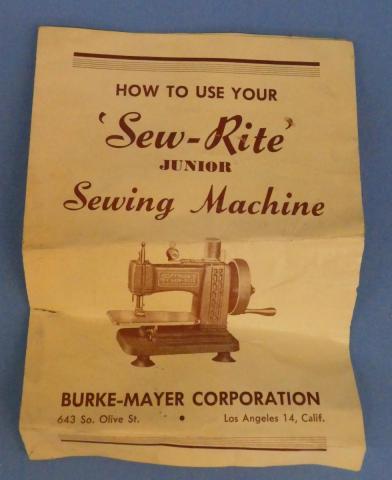 Sew-Rite Sewing machine Sew Rite by Burke-Meyer Corp Metal (hand crank) sewing machine with box and instructions 1940's (?) Price: $50.00Status: Available Additional Images