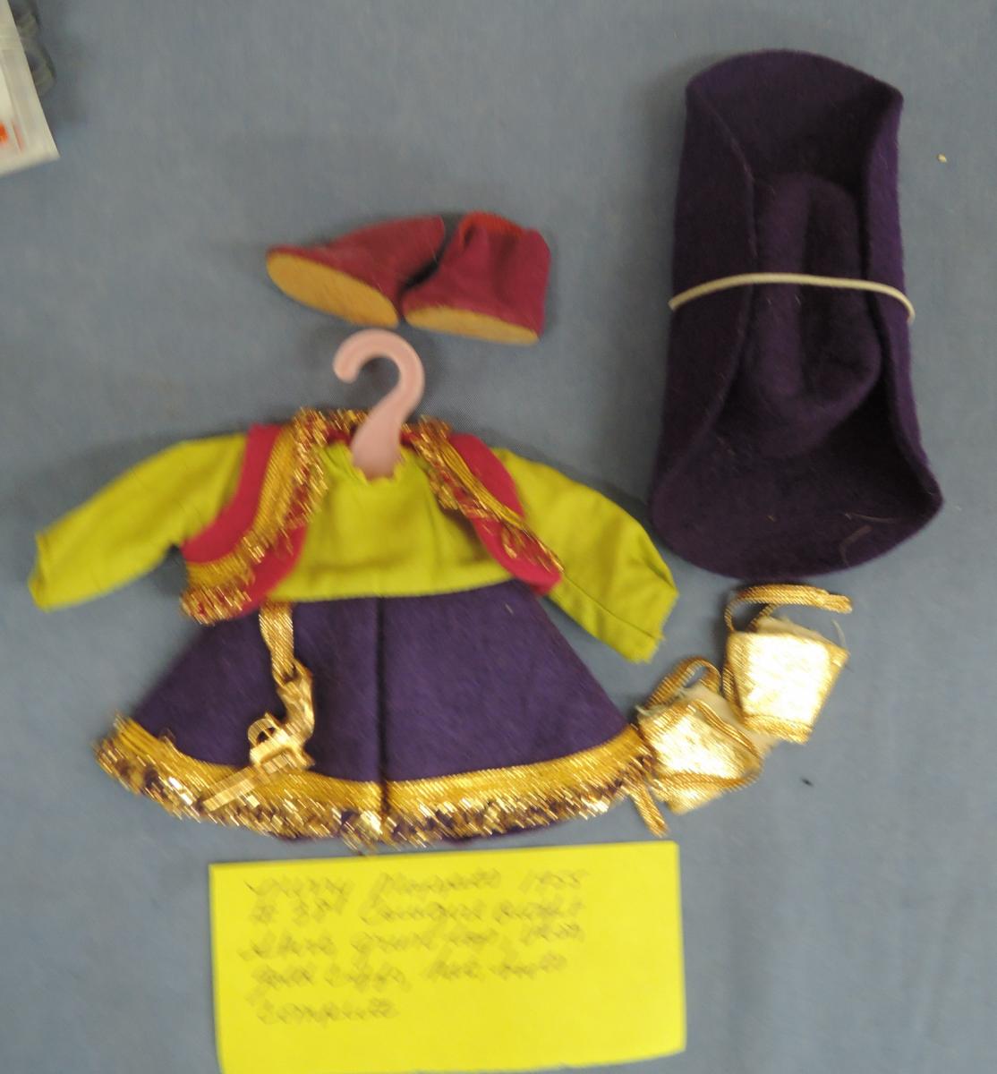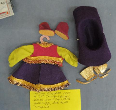 Ginny Outfit Merry Moppets #38, Complete Tagged Skirt, top, vest, gold cuffs, hat and boots Year: 1955Price: $45.00Condition: MintStatus: Available Additional Images