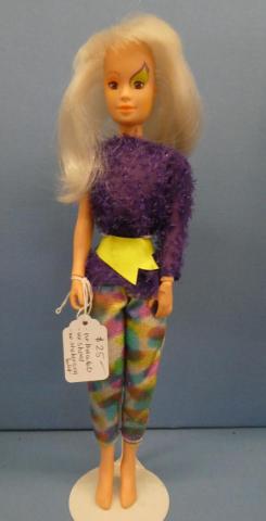 JEM160 1986 Roxy of the Misfits doll HASBRO The Misfits-- rival band to Jem and the Holograms Roxy ~missing bracelets, shoes, stickers on belt, guitar (wear to lame' of pants) Year: 1986Price: $25.00Status: Available Additional Images