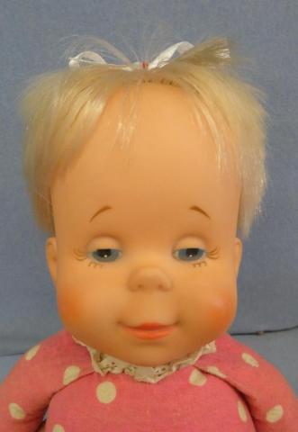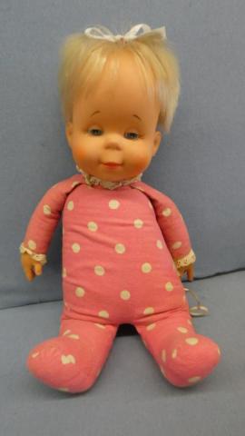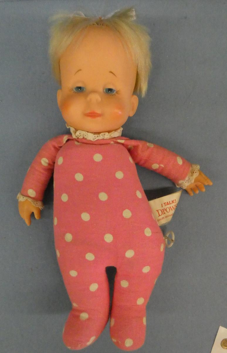 Mattel 1964 Baby Drowsy Baby Drowsy Bright face, very peachy (moreso in person) Still has ribbon tag ~replaced bow ~doesn't talk ~1 button missing off back flap Year: 1964Price: $50.00Status: Available Additional Images