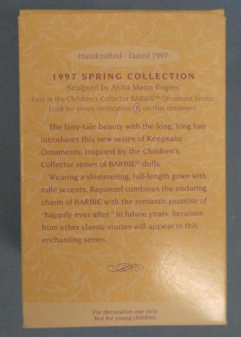 Hallmark Barbie as Rapunzel ornament Hallmark Keepsake Ornament Children's Collector Series Barbie as Rapunzel 39118 (old price tag reside on top of box) Year: 1995Price: $15.00Condition: Never Removed From BoxStatus: Available Additional Images