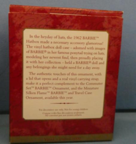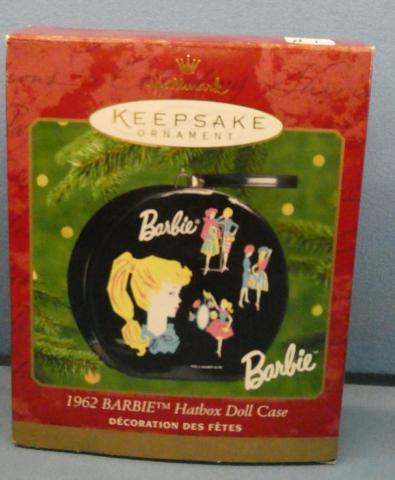 Hallmark Barbie 1962 Hatbox Doll Case ornament Hallmark Keepsake Ornament 1963 Barbie Hatbox Doll Case 56957 Year: 2003Price: $10.00Condition: Never Removed From BoxStatus: Available Additional Images