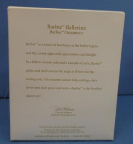 Hallmark Barbie Ballerina 2007 ornament Hallmark Keepsake Ornament Barbie Ballerina 02722 (little tear on top of box) Year: 2007Price: $15.00Condition: Never Removed From BoxStatus: Available Additional Images