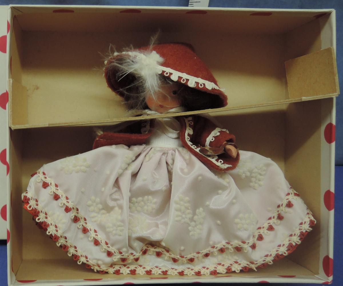 + NA093B Winter #93 Nancy Ann Storybook Seasons Series Jointed leg, wrist tag, slightly pudgy Price: $30.00Status: Available Additional Images
