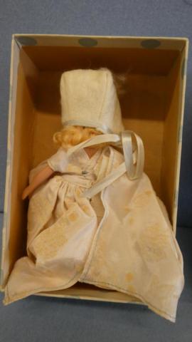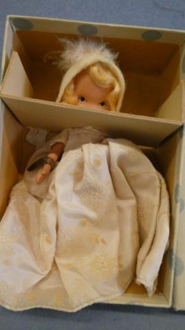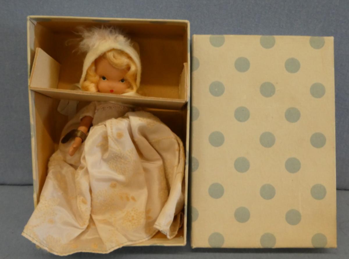+ NA127B Nancy Ann Storybook #127 Merry Little Maid Eyes of Baby Blue Frozen legs, hang tag and box Price: $20.00Status: Available Additional Images