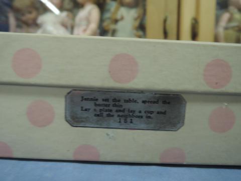 + NA161A Jennie set the Table ... #161 Nancy Ann Storybook Jennie set the table, spread the butter thin. Lay a plate and lay a cup and call the neighbors in Frozen leg, with tag Price: $20.00Status: Available Additional Images