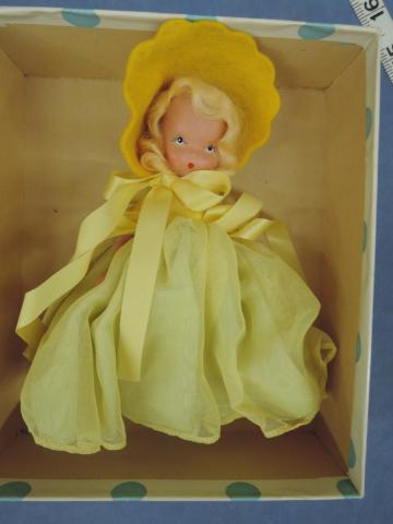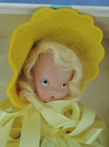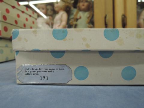 + NA171A Daffy Down Dilly ... #171 Nancy Ann Storybook Daffy Down dilly has come to town In a green petticoat and a yellow gown Frozen leg, no tag Price: $20.00Status: Available Additional Images