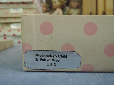 + NA182B Wednesday's Child is Full of Woe Nancy Ann Storybook # 182 Wednesday's Child is Full of Woe Frozen leg, partial tag, box Box lid is not good Price: $20.00Status: Available Additional Images