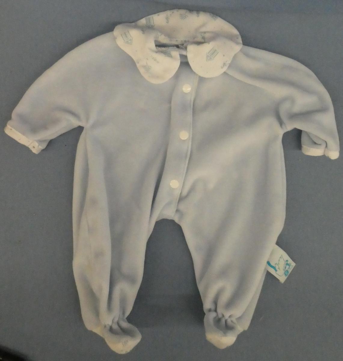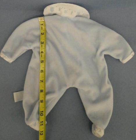GZ02 Gotz Footed Blue Velvet Sleeper 11" Shoulder to foot bottom Fitts Bitty Baby or 15"-16" Doll Price: $10.00Status: Available Additional Images