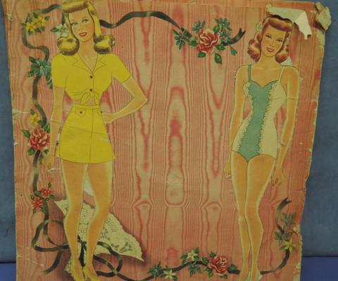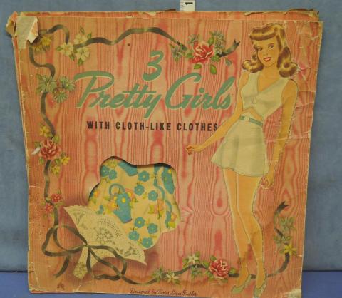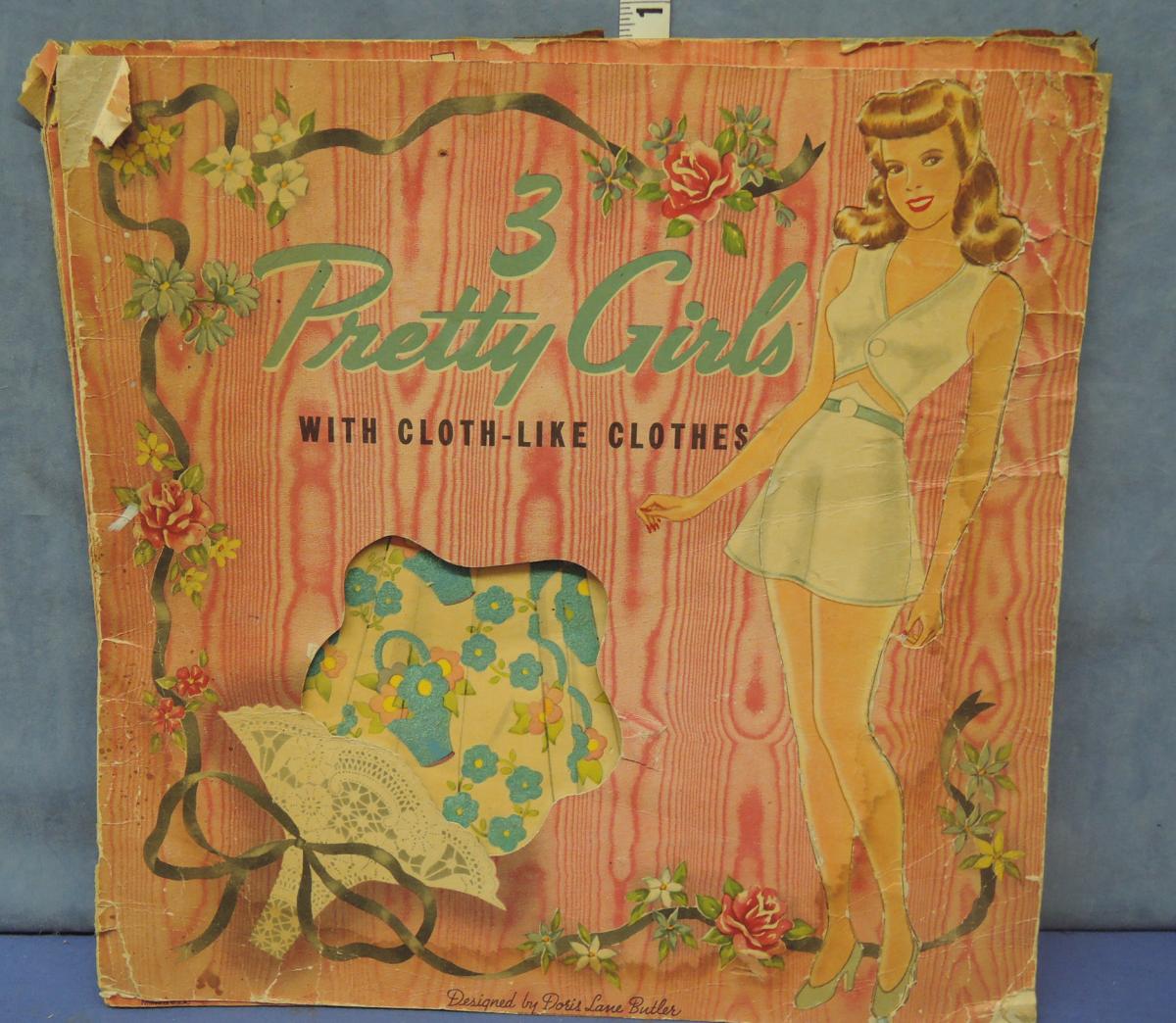 3 Pretty Girls 3 Pretty Girls with Cloth-like Clothes Designed by Doris Lane Butler 1940's One doll has water stain on arm Pages are a little rough but the clothes are uncut and whole Price: $25.00Status: Available Additional Images