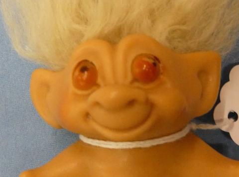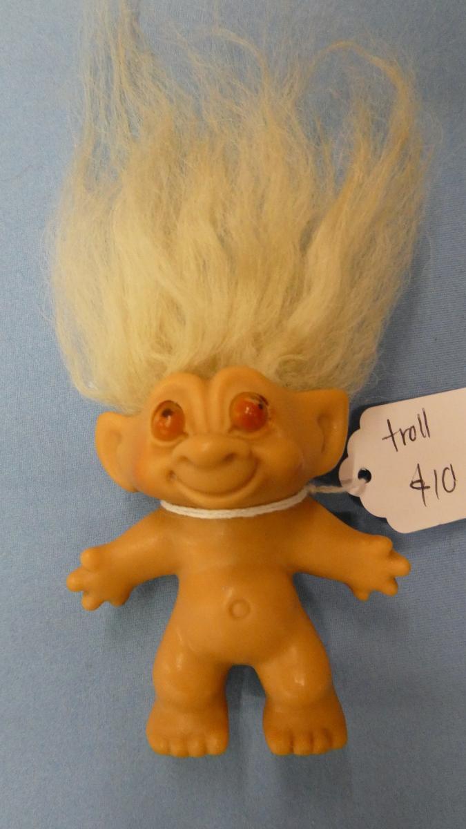 TRO510 unmarked Troll unmarked Troll tan hair, orange eyes (eyes are painted, not set in eyes) about 3" tall to top of head Price: $10.00Status: Available Additional Images