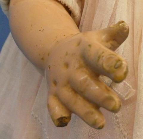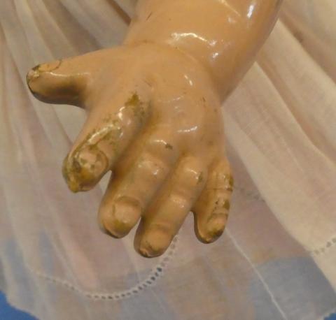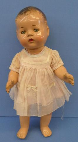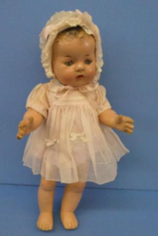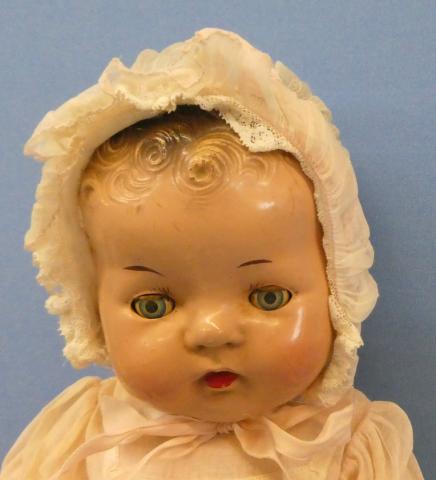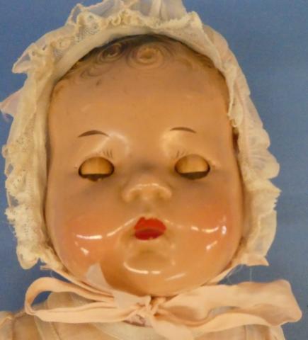 ++ 15" Unmarked Composition Baby Doll Tin eyes, dressed in vintage dress, onesie and bonnet Small amount of damage on right little finger Beautiful face Price: $40.00Status: Available Additional Images